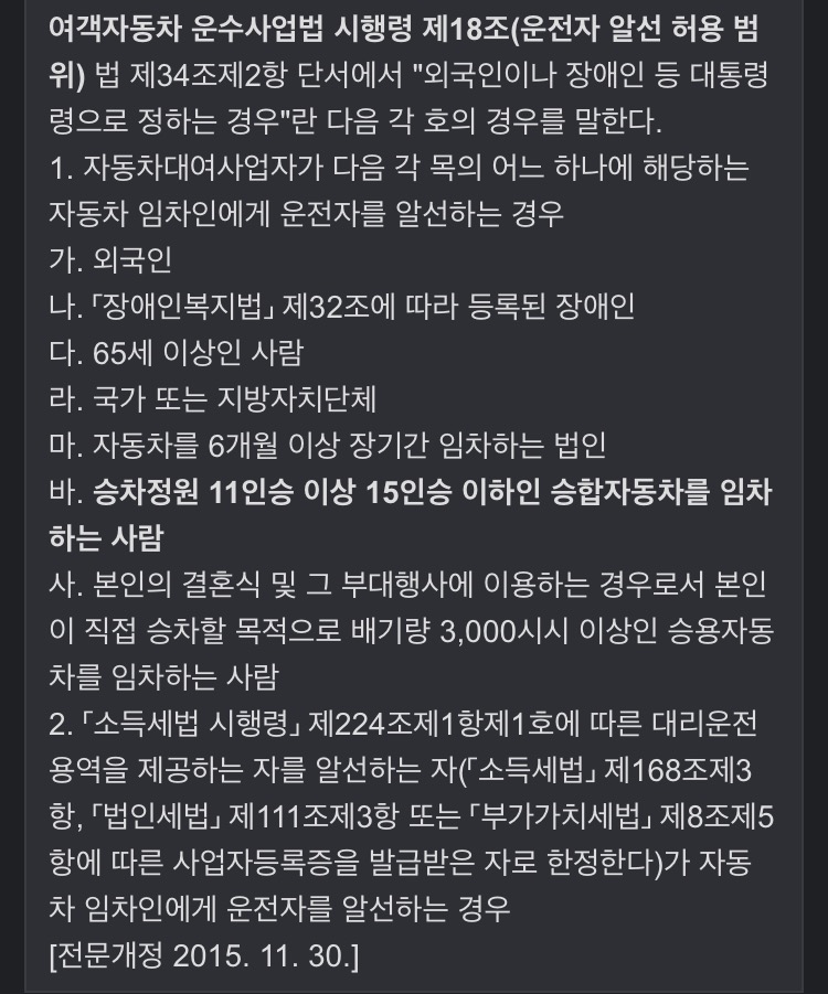 같은 법 시행령에서는 '11인승 이상 15인승 이하인 승합자동차를 임차하는 사람'은