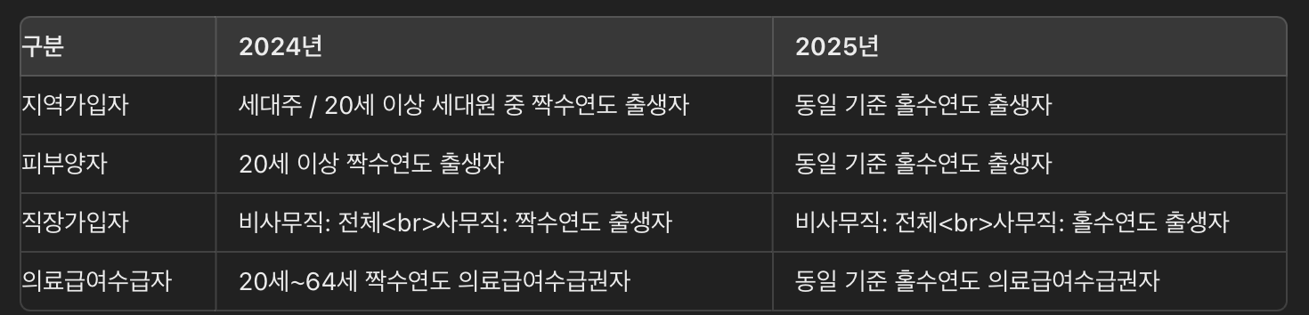 국가건강검진은 지역가입자, 피부양자, 직장가입자, 의료급여수급자를 대상으로 하며, 사실상 건강보험에 가입된 전 국민을 대상으로 합니다. 건강검진은 출생연도에 따라 짝수 해에는 짝수 연도 출생자, 홀수 해에는 홀수 연도 출생자가 대상이 됩니다. 비사무직 직장가입자는 매년 검진을 받습니다.