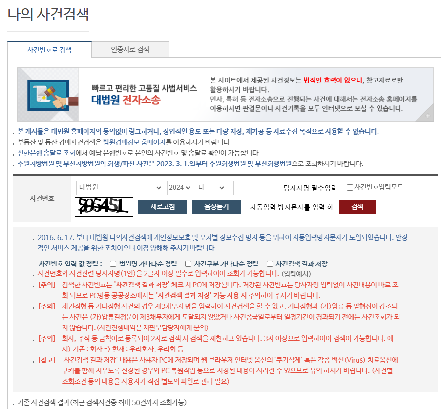 사건번호를 알고 있다면, 사건번호를 입력하고 자동 방지 문자를 입력한 후 검색 버튼을 클릭하면 됩니다.