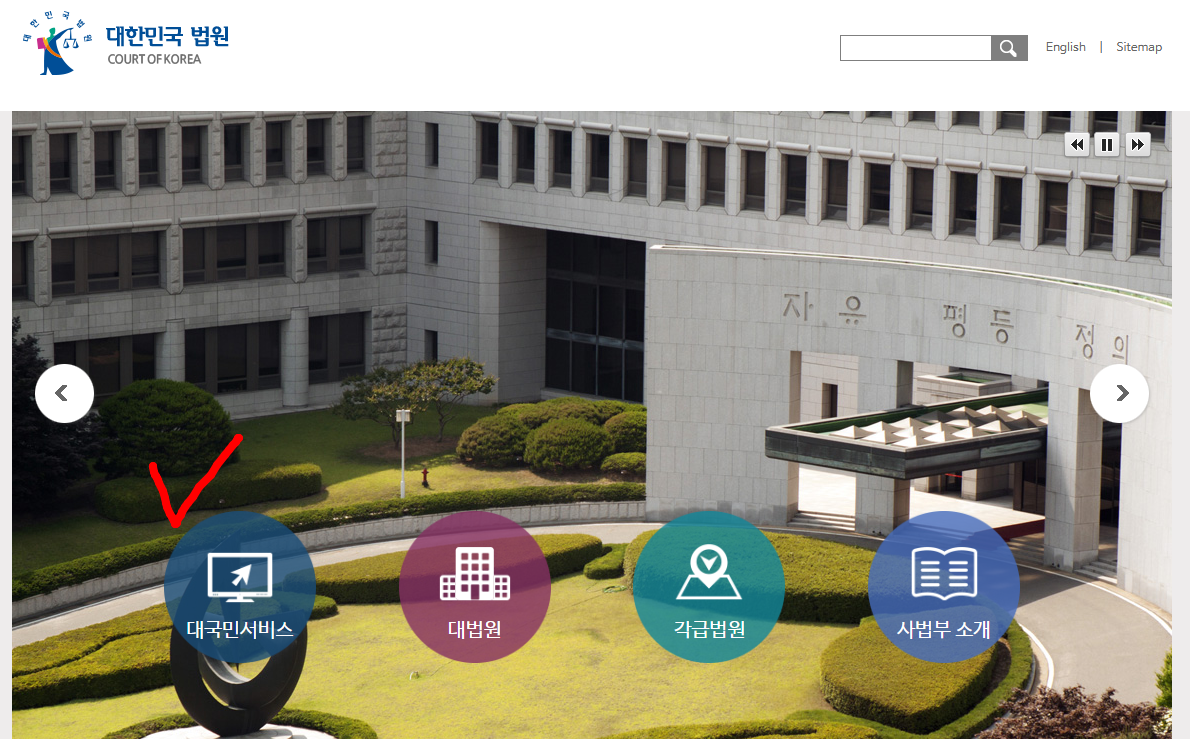법원 사이트에 들어가면 여러 메뉴가 표시됩니다. 이 중에서 [대국민 서비스] 항목을 클릭합니다.