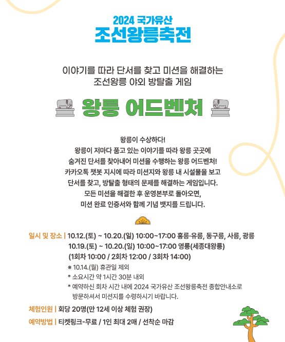이 특별한 장소는 10월 1일부터 11월 30일까지 두 달 동안 개방됩니다. 유네스코 세계문화유산으로 지정된 이곳은 아름다운 단풍과 함께 9개의 조선 왕릉을 감상할 수 있어 가을에 방문하기에 딱 좋은 곳입니다.